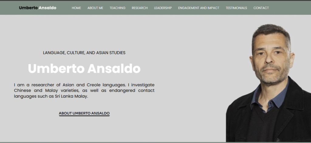 This project highlights the academic contributions of Umberto Ansaldo, a distinguished researcher in Asian and Creole linguistics. The website was designed to present his research focus, academic background, and publications in a clear and scholarly manner, appealing to students, researchers, and collaborators.